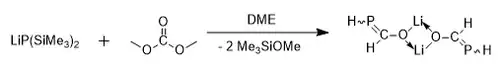 The first reported synthesis and characterisation of phosphaethynolate came from Becker et al. in 1992.[5] They were able to isolate the anion as a lithium salt (in 87% yield) by reacting lithium bis(trimethylsilyl)phosphide with dimethyl carbonate ().[5][6] The x-ray crystallographic analysis of the anion determined the P-C bond length to be 1.555 Å (indicative of a phosphorus-carbon triple bond) and the C-O bond length to be 1.198 Å.[7] Similar studies were performed on derivatives of this structure and the results indicated that dimerisation to form a four-membered Li ring is favoured by this molecule.[5]