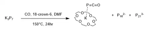 Direct carbonylation was a method also employed by Goicoechea in 2013 in order to synthesis a phosphaethynolate anion stabilised by a potassium cation sequestered in 18-crown-6 ().[10] This method required the carbonylation of solutions of K3P7 at 150 °C and produced by-products that were readily separated during aqueous work ups. The use of aqueous work ups reflects the high stability of the salt in water.[6][10] This method afforded the PCO anion in reasonable yields around 43%. Characterisation of the compound involved infra-red spectroscopy; the band indicative of the P≡C triple bond stretch was observed at 1730 cm−1.[10]