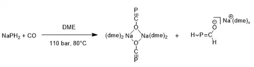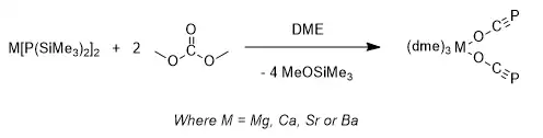 Ten years later, in 2002, Westerhausen et al. published the use of Becker's method to make a family of alkaline earth metal salts of PCO (); this work involved the synthesis of the magnesium, calcium, strontium and barium bis-phosphaethynolates.[5][8] Like the salts previously reported by Becker, the alkali-earth metal analogues were unstable to moisture and air and thus were required to be stored at low temperatures (around −20 °C) in dimethoxyethane solutions.[5][6][8]