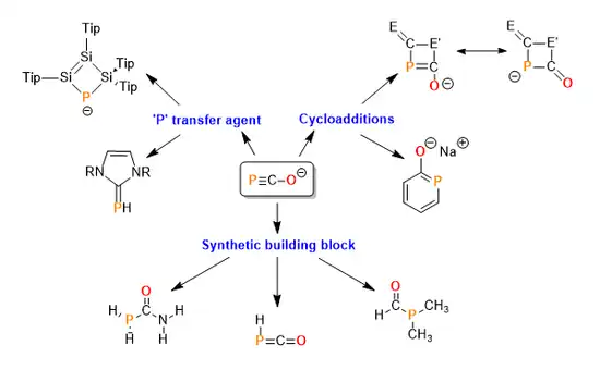 Extensive studies involving the phosphaethynolate anion have shown that it can react in a variety of ways. It has documented use in cycloadditions, as a phosphorus transfer agent, a synthetic building block and as pseudo halide ligands (as described above).