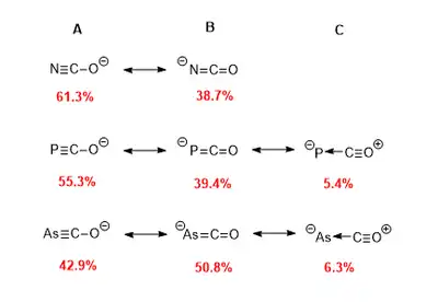Computational studies carried out on the anion such as Natural Bond Orbital (NBO) and Natural Resonance Theory (NRT) analyses can go part way to explain why PCO can react in such a manner .[11] The two dominant resonance forms of the phosphaethynolate anion localise negative charge on either the phosphorus or oxygen atoms meaning both are sites of nucleophilicity.[11] The same applies for the cyanate anion hence why PCO is observed to have similar pseudo-halogenic behaviour.[3][12]
