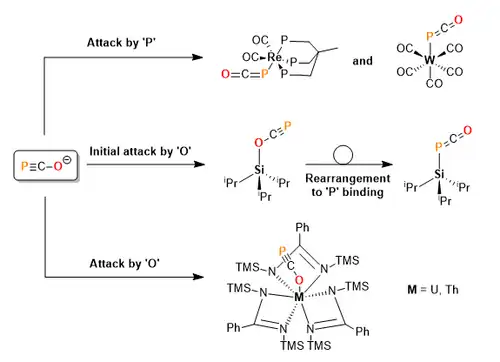 The phosphaethynolate anion is the heavier isoelectronic congener of the cyanate anion. It has been shown that it behaves in a similar way to its lighter analogue, as an ambidentate nucleophile.[3] This ambidentate character of the anion means that it is able to bind via both the phosphorus and oxygen atoms depending on the nature of the centre being coordinated.[3]