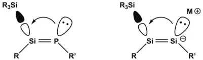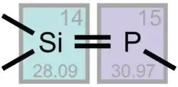 Phosphasilenes or silylidenephosphanes are a class of compounds with silicon-phosphorus double bonds.[1] Since the electronegativity of phosphorus (2.1) is higher than that of silicon (1.9), the "Si=P" moiety of phosphasilene is polarized.[2][3] The degree of polarization can be tuned by altering the coordination numbers of the Si and P centers, or by modifying the electronic properties of the substituents.[2] The phosphasilene Si=P double bond is highly reactive, yet with the choice of proper substituents, it can be stabilized via donor-acceptor interaction or by steric congestion.[3]