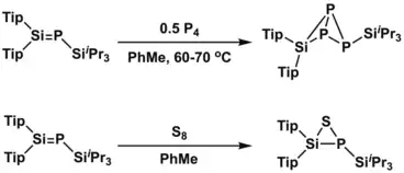 The Si=P moiety of phosphasilene has been reported to demonstrate small molecule activation reactivities analogous to those observed in Si=Si, P=C, and other heavier alkene analogues. For example, phosphasilene with silyl substituents has been shown to activate white phosphorus (P4) under relatively mild reaction conditions to form 1,2,3-triphospha-4-silabicyclo[1.1.0]butanes,[9] which is similar to disilenes' reactivity.[31][2] Analogous to the behavior of phosphaalkenes,[32] phosphasilene can also activate chalcogens such as S8 and Te to form unstable three-membered ring compounds.[7]