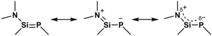 Due to the n(N)–π*(Si=P) orbital interaction, there exists strong delocalization of electron density from nitrogen to phosphorus in phosphasilene with amino-substituents at silicon.[2] Among the resonance structures shown in the figure on the left, the structure in the middle with zwitterionic structure was calculated to have a significant contribution.[2] Therefore, compared to the parent phosphasilene, the double-bond character of the Si–P is significantly reduced in phosphasilene with amino-substituents at Si, giving rise to longer Si–P bond distance.