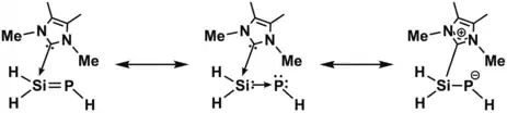 Lewis bases have been shown to react with both three-coordinate and four-coordinate silicon atoms. The coordination of Lewis bases to the three-coordinate silicon atom of phosphasilene can lead to effective stabilization of the Si=P moiety.[2] For example, it has been demonstrated that unstable phosphasilene can react with DMAP and small N-heterocyclic carbene (NHC) to afford the corresponding stable complexes.[23] In phosphasilenes stabilized by NHC, the Si=P bonds are elongated and the negative charge gets localized on the phosphorus atom. Among the resonance structures shown in the figure below, Natural Resonance Theory (NRT) indicates that the third structure with a Si–P single bond is predominant, carrying a resonance weight of 76.3%.[2][24] Therefore, these stabilized phosphasilene can also be interpreted as a silyene-phosphinidene adduct.[2]