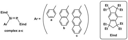 The landmark discovery of the first phosphasilene by NMR spectroscopy was made in 1984 by Bickelhaupt et al.[4] The first phosphasilene came with bulky aryl substituents at the phosphorus and silicon atoms.[4] Almost a decade after this spectroscopic observation, the first structural characterization of phosphasilene was achieved in 1993 by Niecke et al.[5] The successful isolation of phosphasilenes with silicon-phosphorus double bonds represents one of the discoveries that challenged and disproved the "double-bond rule".
