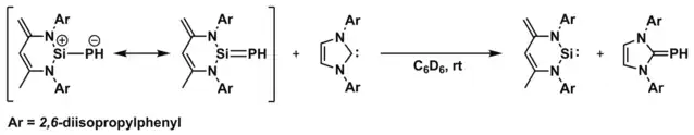 Phosphasilenes with significant zwitterionic characters undergoes facile hemolytic cleavage of the fragile Si=P bond. This can be utilized for the liberation and transfer of phosphinidene (:PH) to unsaturated organic molecules.[29] Driess et al. demonstrated that a fragile "half"-parent phosphasilene LSi=PH (L = CH[(C=CH2)CMe(NAr)2]; Ar = 2,6-iPr2C6H3) with highly shielded PH moiety is capable of transferring :PH to NHC.[29]