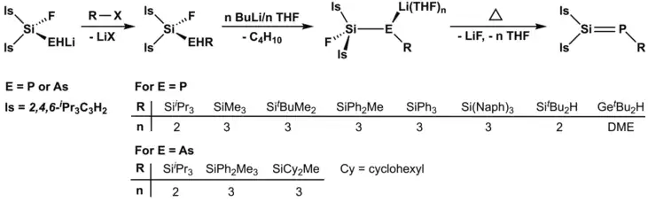 - 1 2 Driess, M.; Pritzkow, H.; Rell, S.; Winkler, U. (1996). "Synthesis and Unusual Reactivity of Compounds Containing Silicon−Phosphorus and Silicon−Arsenic Double Bonds: New Silylidenephosphanes and -arsanes of the Type R2SiE(SiR3) (E = P, As)". Organometallics. 15 (7): 1845–1855. doi:10.1021/om9508851.