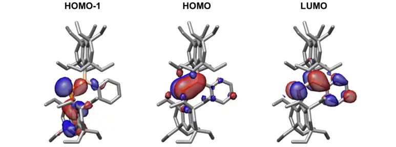 Theoretical investigation by DFT (B3LYP/6-31G(d) level) revealed that this phosphasilene bears two highly localized lone pairs on the phosphorus atom due to the LSi=PH ↔ LSi–P+H− resonance. Based on natural bond orbital (NBO) analysis, the σ bond of Si=P involves even contributions from Si and P, while the π bond (HOMO-1) is strongly polarized to the phosphorus atom. This indicates that the π bond between silicon and phosphorus is not predominant, supporting the significance of the zwitterionic resonance structure in the description of Si–P bonding.[29]