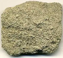 Limestones and mudstones are common phosphate-bearing rocks.[4] Phosphate-rich sedimentary rocks can occur in dark brown to black beds, ranging from centimeter-sized laminae to beds that are several meters thick. Although these thick beds can exist, they are rarely only composed of phosphatic sedimentary rocks. Phosphatic sedimentary rocks are commonly accompanied by or interbedded with shales, cherts, limestone, dolomites and sometimes sandstone.[4] These layers contain the same textures and structures as fine-grained limestones and may represent diagenetic replacements of carbonate minerals by phosphates.[2] They also can be composed of peloids, ooids, fossils, and clasts that are made up of apatite. There are some phosphorites that are very small and have no distinctive granular textures. This means that their textures are similar to that of collophane, or fine micrite-like texture. Phosphatic grains may be accompanied by organic matter, clay minerals, silt-sized detrital grains, and pyrite. Peloidal or pelletal phosphorites occur normally; whereas oolitic phosphorites are not common.[4]