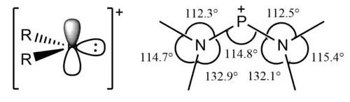 According to X-ray crystallography, [(i-Pr2N)2P]+ is nearly planar consistent with sp2-hybridized phosphorus center.[6] The planarity of the nitrogen center is consistent with the resonance of the lone pair of the nitrogen atom as a pi bond to the empty phosphorus 3p orbital perpendicular to the N−P−N plane. An idealized sp2 phosphorus center would expect an N−P−N angle of 120°. The tighter N−P−N angle observed in the crystal structure can be interpreted as the result of repulsion between the phosphorus lone pair with the bulky i-Pr2N ligands, as the P(NH