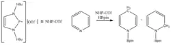 There are few examples of reactions catalyzed by phosphenium. In 2018, Rei Kinjo and coworkers reported the hydroboration of pyridines by the NHP salt, 1,3,2-diazaphosphenium triflate. The NHP is proposed to act as a hydride transfer reagent in this reaction.[13]