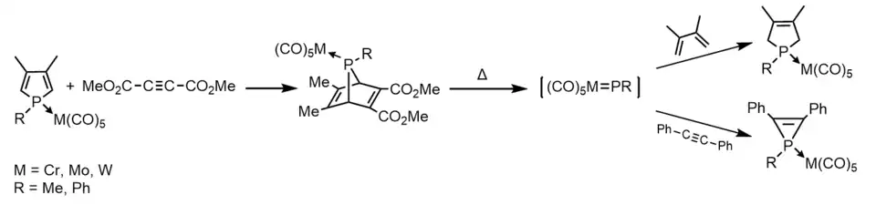 Terminal transition-metal-complexed phosphinidenes LnM=P-R are phosphorus analogs of transition metal carbene complexes. The first "metal-phosphinidine" was reported by Marinetti et al. They generated the transient species [(OC)5M=P-Ph] by fragmentation of 7-phosphanorbornadiene molybdenum and tungsten complexes inside a mass spectrometer.[14][15] Soon after, they discovered that these 7-phosphanorbornadiene complexes could be used to transfer the phosphinidene complex [(OC)5M=P-R] to various unsaturated substrates.[15][16]