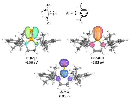 Density functional theory and Natural bond orbital (NBO) calculations were used to gain insight into the structure and bonding of these phosphino-phosphinidenes. DFT calculations at the M06-2X/Def2-SVP level of theory on the phospino-phosphinidene with bulky 2,6-bis[4-tert-butylphenyl)methyl]-4-methylphenyl groups suggest that the tri-coordinated phosphorus atom exists in a planar environment.[3] Calculations at the M06-2X/def2-TZVPP//M06-2X/def2-SVP level of theory were applied to a simplified model compound with diisopropylphenyl (Dipp) groups so as to reduce the computational cost for detailed NBO analysis.[3] Inspection of the outputted wavefunctions shows that the HOMO and HOMO-1 are P-P π-bonding orbitals and the LUMO is a P-P π*-antibonding orbital.[3] Further evidence of multiple bond character between the phosphorus atoms was provided by natural resonance theory and a large Wiberg bond index (P1-P2: 2.34).[3] Natural population analysis assigned a negative partial charge to the terminal phosphorus atom (-0.34 q) and a positive charge to the tri-coordinated phosphorus atom (1.16 q).[3]