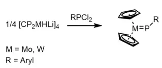 Terminal phosphinidene complexes of the type Cp2M=P-R (M = Mo, W) can be obtained by combining aryl-dichlorophosphines RPCl2 with [Cp2MHLi]4.[20]