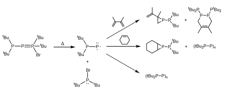 Fritz et al. found that this particular phospha-Wittig reagent thermally decomposes at 20 °C to give tBu2PBr, LiBr, and cyclophosphanes.[13] The authors proposed that the singlet phosphino-phosphinidene tBu2PP was formed as an intermediate in this reaction. Further evidence for this was provided by trapping experiments, where the thermal decomposition of the phospha-Wittig reagent in the presence of 3,4,-dimethyl-1,3-butadiene and cyclohexene gave rise to the products shown in the figure below.[13]