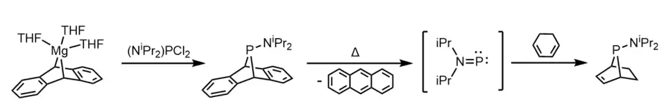 Treatment of a bulky phosphine chloride (RPCl2) with magnesium anthracene affords a dibenzo-7-phosphanorbornadiene compound (RPA).[11] Under thermal conditions, the RPA compound (R = NiPr2) decomposes to yield anthracene; kinetic experiments found this decomposition to be first-order.[11] It was hypothesized that the amino-phosphinidene iPr2NP is formed as a transient intermediate species, and this was corroborated by an experiment where 1,3-cyclohexadiene was used as a trapping agent, forming anti-iPr2NP(C6H8).[11]