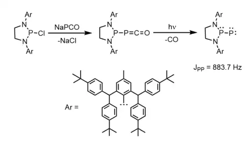 The first singlet phosphino-phosphinidene has been prepared using extremely bulky substituents.[3] The authors prepared a chlorodiazaphospholidine with bulky (2,6-bis[(4-tert-butylphenyl)methyl]-4-methylphenyl) groups, and then synthesized the corresponding phosphaketene. Subsequent photolytic decarbonylation of the phosphaketene produced the phosphino-phosphinidene product as a yellow-orange solid that is stable at room temperature but decomposes immediately in the presence of air and moisture.[3] 31P NMR spectroscopy shows assigned product peaks at 80.2 and -200.4 ppm, with a J-coupling constant of JPP = 883.7 Hz. The very high P-P coupling constant is indicative of P-P multiple bond character.[3] The air/water sensitivity and high solubility of this compound prevented characterization by X-ray crystallography.[3]