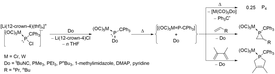 Donor-stabilized terminal phosphinidene complexes are also known,[17] which could release free phosphinidene complexes LnM=P-R at mild conditions by P-donor dissociation reactions.[18][19] The phosphinidene complexes decomposed to white phosphorus if no unsaturated substrates were provided.[18]