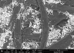SEM image of wood pulp (dark fibers) and tetrapodal zinc oxide micro particles (white and spiky) in paper.[31]