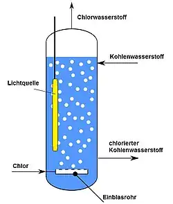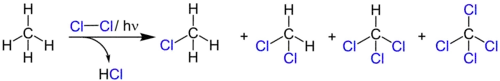 An example of photochlorination at low temperatures and under ambient pressure is the chlorination of chloromethane to dichloromethane. The liquefied chloromethane (boiling point -24 °C) is mixed with chlorine in the dark and then irradiated with a mercury-vapor lamp. The resulting dichloromethane has a boiling point of 41 °C and is later separated by distillation from methyl chloride.[16]