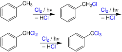 The photochlorination of toluene is selective for the methyl group. Mono- to trichlorinated products are obtained. The most important of which is the mono-substituted benzyl chloride, which is hydrolyzed to benzyl alcohol. Benzyl chloride can also be converted via benzyl cyanide with subsequent hydrolysis into phenylacetic acid.[22][23] The disubstituted benzal chloride is converted to benzaldehyde, a popular flavorant[24] and intermediate for the production of malachite green and other dyes.[25] The trisubstituted benzotrichloride is used for the hydrolysis of the synthesis of benzoyl chloride:[26]