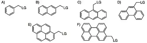 Figure 5: Benzyl-based PPGs with polycyclic aromatic cores: A) benzene; B) naphthalene; C) anthracene; D) phenanthrene; E) phyene and; F) perylene.