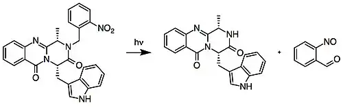 Figure 6. The final step in Busuyek's synthesis of ent-Fumiquinazoline is the removal of a 2-nitrobenzyl PPG through a Norrish Type II mechanism.