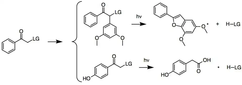 As with nitrobenzyl-based PPGs, several modifications are known. For example, the 3',5'-dimethoxybenzoin PPG (DMB) contains a 3,5-dimethoxyphenyl substituent on the carbonyl's α-carbon.[19] Under certain conditions, DMB has exhibited quantum yields as high as 0.64.[2] Additionally, the p-hydroxyphenacyl PPG (pHP) has been designed to react through a photo-Favorskii rearrangement.[26][27] This mechanism yields the carboxylic acid as the exclusive photoproduct; the key benefit of the pHP PPG is the lack of secondary photoreactions and the significantly different UV absorption profiles of the products and reactants. While the quantum yield of the p-hydroxyphenacyl PPG is generally in the 0.1-0.4 range, it can increase to near unity when releasing a good leaving group such as a tosylate. The photoextrusion of the leaving group from the pHP PPG is so effective, that it also releases even poor nucleofuges such as amines (with the quantum yield in the 0.01-0.5 range, and dependent on solution pH).[28] The Additionally, photorelease occurs on the nanosecond timeframe, with krelease > 108 s−1.[2] The o-hydroxyphenacyl PPG has been introduced as an alternative with absorption band shifted closer towards the visible region, however it has slightly lower quantum yields of deprotection (generally 0.1-0.3) due to excited state proton transfer available as an alternative deactivation pathway.[29]
