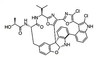 - ↑ Li, J.; Jeong, S.; Esser, L.; Harran, P. G. (17 December 2001). "Total Synthesis of Nominal Diazonamides-Part 1: Convergent Preparation of the Structure Proposed for (−)-Diazonamide A". Angewandte Chemie International Edition. 40 (24): 4765–4769. doi:10.1002/1521-3773(20011217)40:24<4765::AID-ANIE4765>3.0.CO;2-1. PMID 12404411.