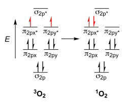 While many stable molecules’ HOMOs consist of bonding molecular orbitals and therefore require a moderate energy jump from bonding to antibonding to reach their first excited state, the antibonding nature of molecular oxygen’s HOMO allows for a lower energy gap between its ground state and first excited state. This makes excitation of O2 a less energetically restrictive process. In the first excited state of O2, a 22 kcal/mol energy increase from the ground state, both electrons in the antibonding orbitals occupy a degenerate π* orbital, and oxygen is now in a singlet state (indicated as 1O2).[3] 1O2 is very reactive with a lifetime between 10-100 μs.[4]