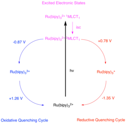 The long-lived triplet excited state accessible by photoexcitation is both a more potent reducing agent and a more potent oxidizing agent than the ground state of the catalyst. Since sensitizer is coordinatively saturated, electron transfer must occur by an outer sphere process, where the electron tunnels between the catalyst and the substrate.