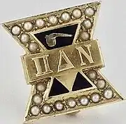 Pi Delta Nu's badge was originally an oblong square in gold, with a band in the center supporting its letters. By 1935, this was replaced by a stylized pin in gold, consisting of two equilateral triangles pointing up and down and overlapping, with the raised Greek letters ΠΔΝ on a center band. Above the letters was a retort and below an emerald.[1] The pin was surrounded by 22 pearls, eleven above and eleven below. The pledge pin is a small silver retort with the letters ΠΔΝ on the bowl.[1]