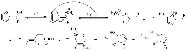 It was proposed by Piancatelli that the reaction is a thermal electrocyclic reaction of a conrotatory 4π electron system while studying specifics of the mechanism conditions when synthesizing the 4-hydroxycyclopentenone derivatives. This mechanism was suggested when studying 1H NMR spectra as it became apparent that the final products exclusively delivered the trans isomer.[2]