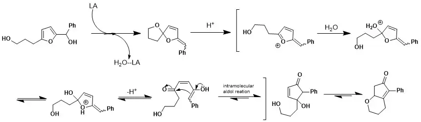 Another proposed mechanism is from Yin and co-workers that was studied while completing the rearrangement of 2-furylcarbinols with a hydroxyalkyl chain at the 5 position. Yin rationalized the mechanism by utilizing an aldol-type intramolecular addition.[2]