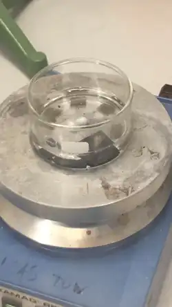 Once the mixture has stabilized, it can be further heated to sustain its reactivity.[7] The hot (often bubbling) solution cleans organic compounds off substrates and oxidizes or hydroxylates most metal surfaces. Cleaning usually requires about 10 to 40 minutes, after which the substrates can be removed from the solution and rinsed with deionized water.