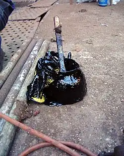 Pitch, a traditional naval store, was traditionally used to help caulk the seams of wooden sailing vessels (see shipbuilding). Other important historic uses included coating earthenware vessels for the preservation of wine, waterproofing wooden containers, and making torches. It was also used to make patent fuel from coal slack around the turn of the 19th century.[3] Petroleum-derived pitch is black in colour, hence the adjectival phrase "pitch-black".[4]