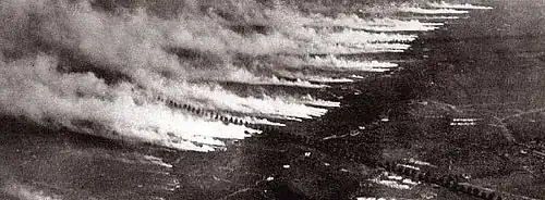 Germany, the first side to employ chemical warfare on the battlefield,[40] simply opened canisters of chlorine upwind of the opposing side and let the prevailing winds do the dissemination. Soon after, the French modified artillery munitions to contain phosgene – a much more effective method that became the principal means of delivery.[41]
