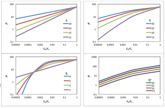 where is equilibrium adsorbed concentration of adsorbent in mg/g, is maximum adsorbed concentration of adsorbent in mg/g, is the effective adsorption potential, where equal to , is equilibrium concentration of adsorbent in the solution phase in mg/L, and is the adsorbent solubility in water in mg/L.[6]
