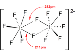 In general, the structures of most heteropolyhalogen ions and lower isopolyhalogen ions were in agreement with the VSEPR model. However, there were exceptional cases. For example, when the central atom is heavy and has seven lone pairs, such as [BrF6]− and [IF6]−, they have a regular octahedral arrangement of fluoride ligands instead of a distorted one due to the presence of a stereochemically inert lone pair. More deviations from the ideal VSEPR model were found in the solid state structures due to strong cation-anion interactions, which also complicates interpretation of vibrational spectroscopic data. In all known structures of the polyhalogen anion salts, the anions make very close contact, via halogen bridges, with the counter-cations.[4] For example, in the solid state, [IF6]− is not regularly octahedral, as solid state structure of [(CH3)4N]+[IF6]− reveals loosely bound [I2F11]2− dimers. Significant cation-anion interactions were also found in [BrF2]+[SbF6]−, [ClF2]+[SbF6]−, [BrF4]+[Sb6F11]−.[2]