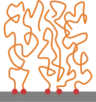 In materials science, a polymer brush is the name given to a surface coating consisting of polymers tethered to a surface.[1] The brush may be either in a solvated state, where the tethered polymer layer consists of polymer and solvent, or in a melt state, where the tethered chains completely fill up the space available. These polymer layers can be tethered to flat substrates such as silicon wafers, or highly curved substrates such as nanoparticles. Also, polymers can be tethered in high density to another single polymer chain, although this arrangement is normally named a bottle brush.[2] Additionally, there is a separate class of polyelectrolyte brushes, when the polymer chains themselves carry an electrostatic charge.