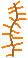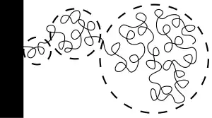 Polymer molecules within a brush are stretched away from the attachment surface as a result of the fact that they repel each other (steric repulsion or osmotic pressure). More precisely,[7] they are more elongated near the attachment point and unstretched at the free end, as depicted on the drawing.