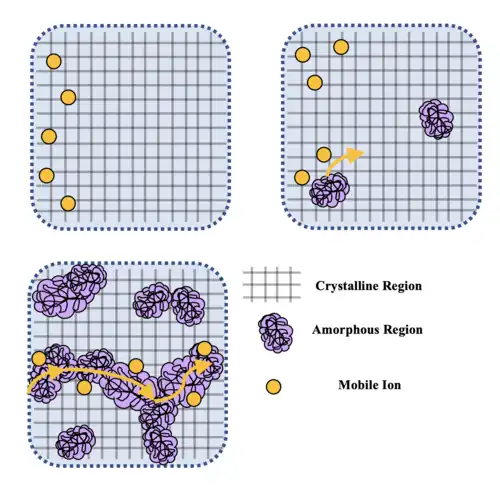 Ion transport is impacted by concentration of the counterion and the ability of polymer chains to remain mobile.[1] It is commonly believed that the greater the ability of a polymer matrix to move, the better the ion conductivity will be; however, this is not well understood as crystalline polymer electrolytes have been shown to be more conductive than an amorphous version of the same electrolyte. It is believed there are multiple modes of ion transport. In crystalline polymer electrolyte, the organization of the chains promotes the formation of interchain "tunnels" in which the ion of interest is able to hop between coordination sites, while the counterion moves along the polymer chain.[3] These tunnels allows control over anion and cation flow in crystalline polymer electrolytes because they highly ordered crystalline domains are selective to an ion exclude its counter ion allowing for their separation.[25] This can increase conductivity in crystalline polymer electrolytes. In amorphous polymers that show enhanced conductivity, it is propose that the amorphous character enables greater movement of chains and this increases mobility of ions as their coordination is transient.[3][4] The adjacent image illustrates a possible mechanisms for ion transport through short range chain ordering and motions in amorphous regions of polymer electrolytes.