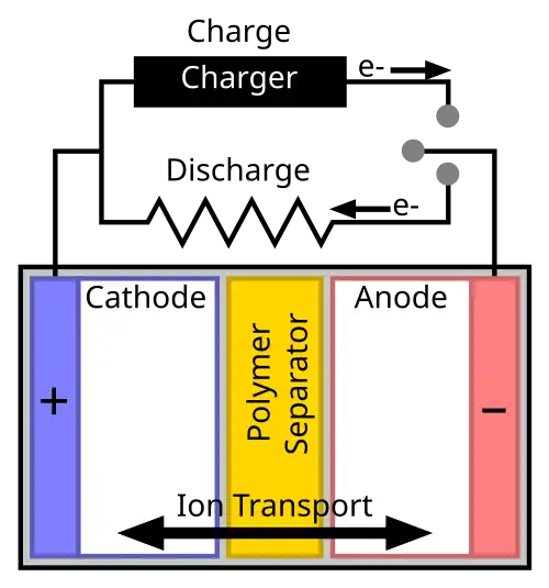 A separator is a permeable membrane placed between a battery's anode and cathode. The main function of a separator is to keep the two electrodes apart to prevent electrical short circuits while also allowing the transport of ionic charge carriers that are needed to close the circuit during the passage of current in an electrochemical cell.[1]
