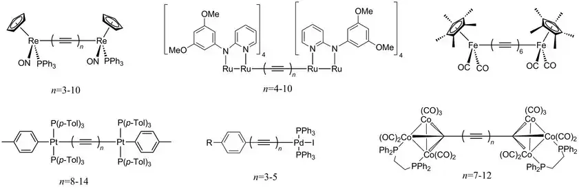 Organometallic polyynes capped with metal complexes are well characterized. As of the mid-2010s, the most intense research has concerned rhenium (Re(−C≡C−)nRe, n = 3–10),[17] ruthenium (RuRu(−C≡C−)nRuRu, n = 4–10),[18] iron (Fe(−C≡C−)6Fe),[19] platinum (Pt(−C≡C−)nPt, n = 8–14),[20] palladium (Ar(−C≡C−)nPd, n = 3–5, Ar = aryl),[21] and cobalt (Co3C(−C≡C−)nCCo3, n = 7–13)[22] complexes.