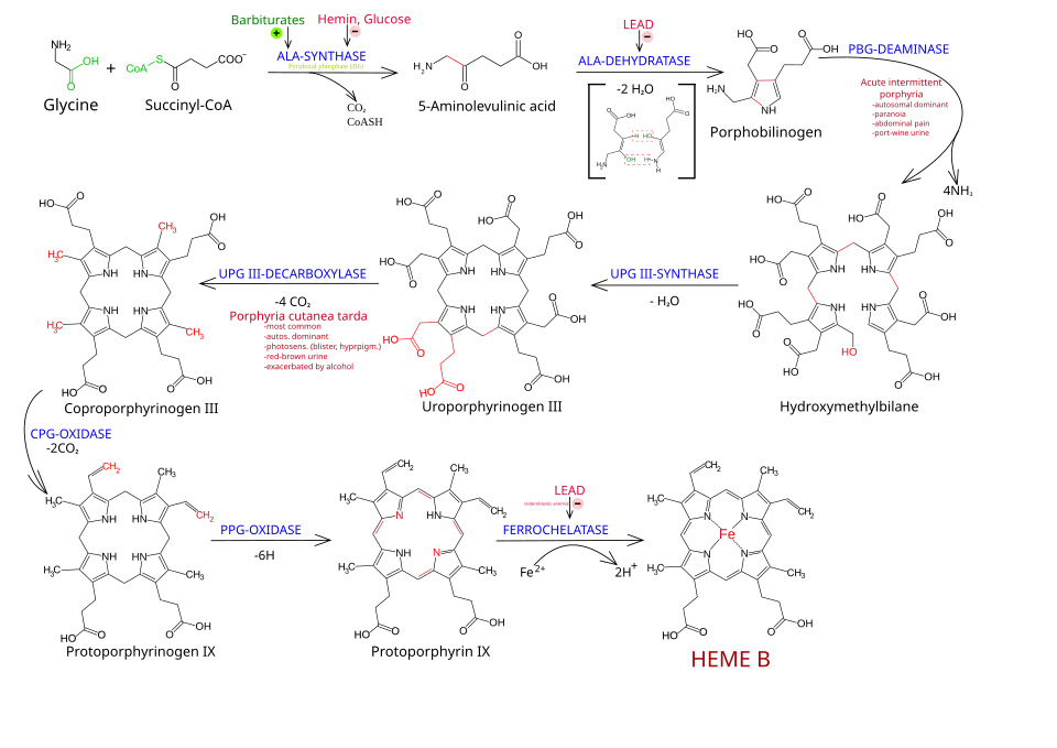 Heme B biosynthesis pathway and its modulators. Major enzyme deficiences are also shown.