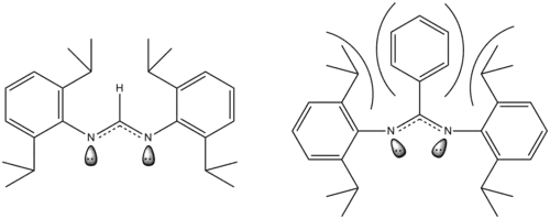 The above example shows the ligand used in the dimolybdenum complex shown earlier. When the carbon between the two nitrogens in the ligand has a hydrogen bound to it, the steric repulsion is small. However, when the hydrogen is replaced with a much more bulky phenyl ring the steric repulsion increases dramatically and the ligand "bows" which causes a change in the orientation of the lone pairs of electrons on the nitrogen atoms. These lone pairs are what is responsible for forming bonds with the metal centers so forcing them to move closer together also forces the metal centers to be positioned closer together. Thus, decreasing the length of the quintuple bond. In the case where this ligand is bound to quintuply bonded dimolybdenum the quintuple bond length goes from 201.87 pm to 201.57 pm when the hydrogen in replaced with a phenyl group. Similar results have also been demonstrated in dichromium quintuple bond complexes as well.[12]