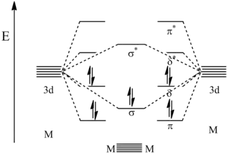 A quintuple bond in chemistry is an unusual type of chemical bond, first reported in 2005 for a dichromium compound. Single bonds, double bonds, and triple bonds are commonplace in chemistry. Quadruple bonds are rarer and are currently known only among the transition metals, especially for Cr, Mo, W, and Re, e.g. [Mo2Cl8]4− and [Re2Cl8]2−. In a quintuple bond, ten electrons participate in bonding between the two metal centers, allocated as σ2π4δ4.