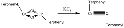In some cases of high-order bonds between metal atoms, the metal-metal bonding is facilitated by ligands that link the two metal centers and reduce the interatomic distance. By contrast, the chromium dimer with quintuple bonding is stabilized by a bulky terphenyl (2,6-[(2,6-diisopropyl)phenyl]phenyl) ligands. The species is stable up to 200 °C.[1][2] The chromium–chromium quintuple bond has been analyzed with multireference ab initio and DFT methods,[3] which were also used to elucidate the role of the terphenyl ligand, in which the flanking aryls were shown to interact very weakly with the chromium atoms, causing only a small weakening of the quintuple bond.[4] A 2007 theoretical study identified two global minima for quintuple bonded RMMR compounds: a trans-bent molecular geometry and surprisingly another trans-bent geometry with the R substituent in a bridging position.[5]